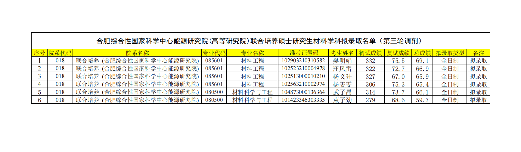 能源研究院(高等研究院)联合培养硕士研究生材料学科拟录取名单(第三轮调剂)